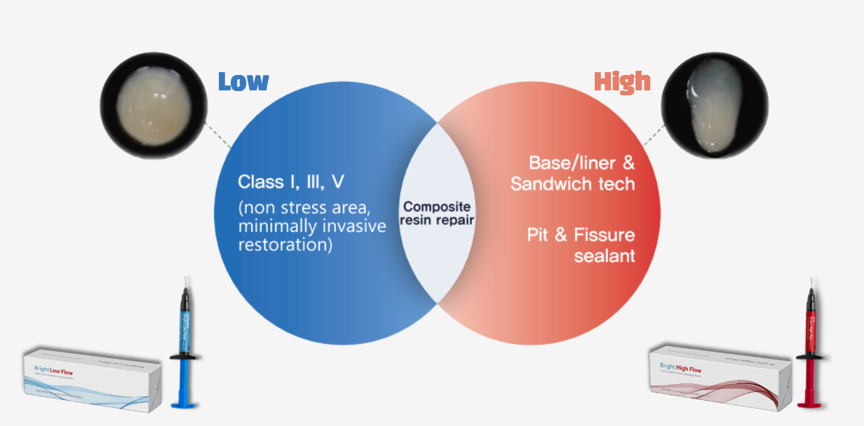 Low Flow is suitable for minimally invasive restorations, while High Flow provides stable application for base, liner, and sealant procedures.