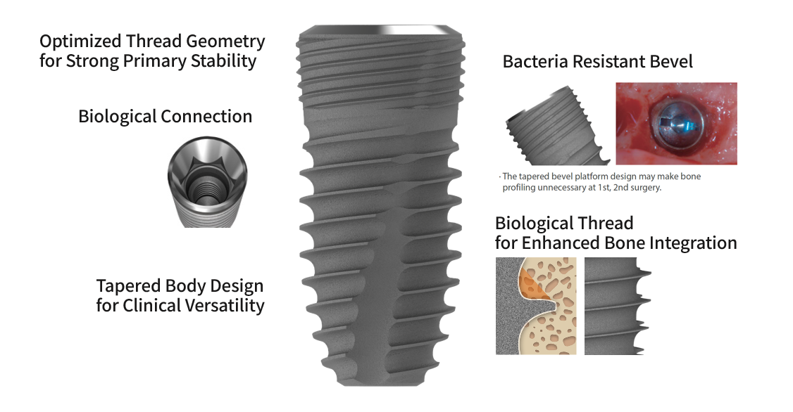 The tapered implant body allows controlled insertion torque and excellent adaptability to narrow ridges or uneven bone density.