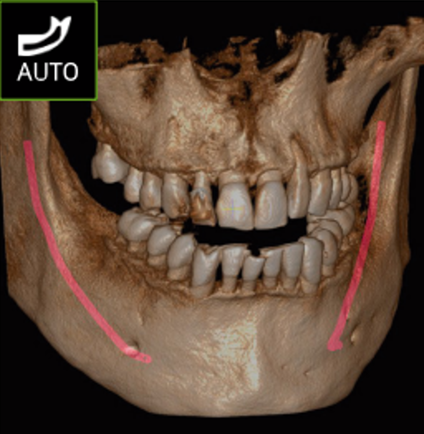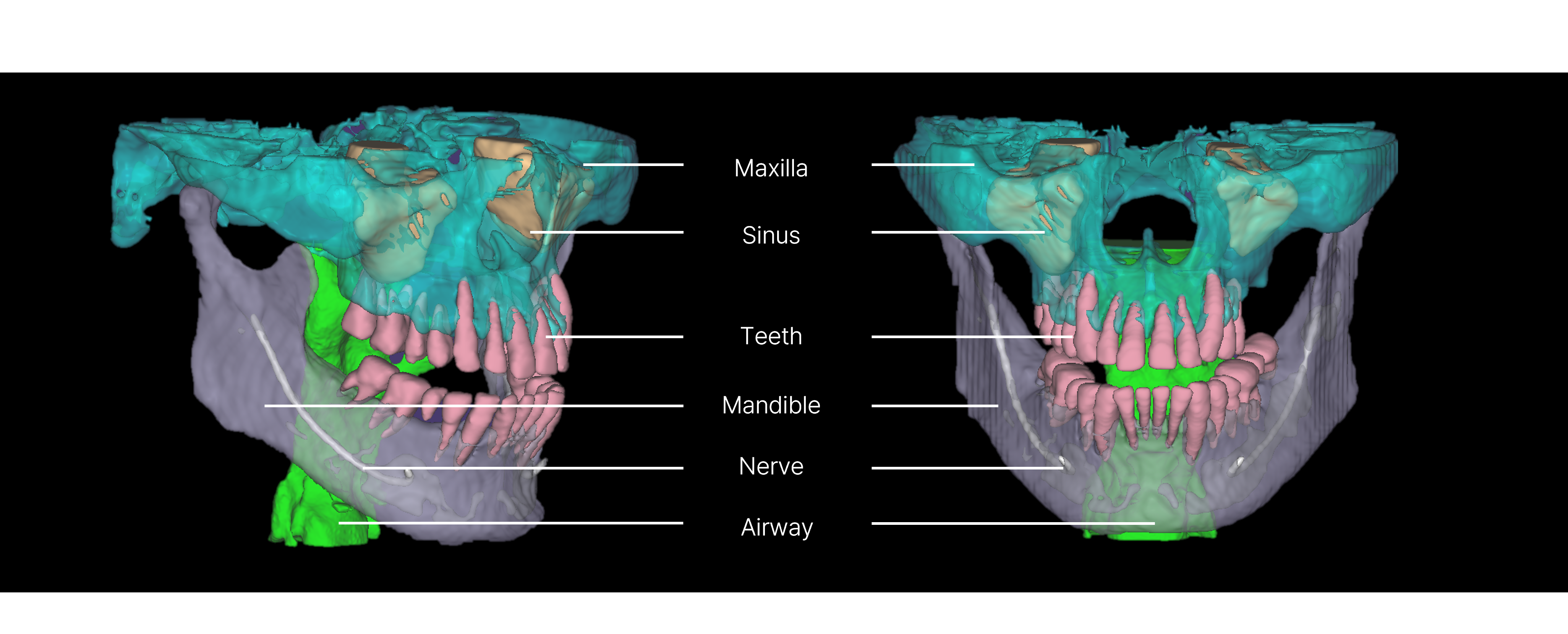 The key anatomic structures such as teeth, nerves, bones, sinus, and airway are automatically segmented for easy visualization.