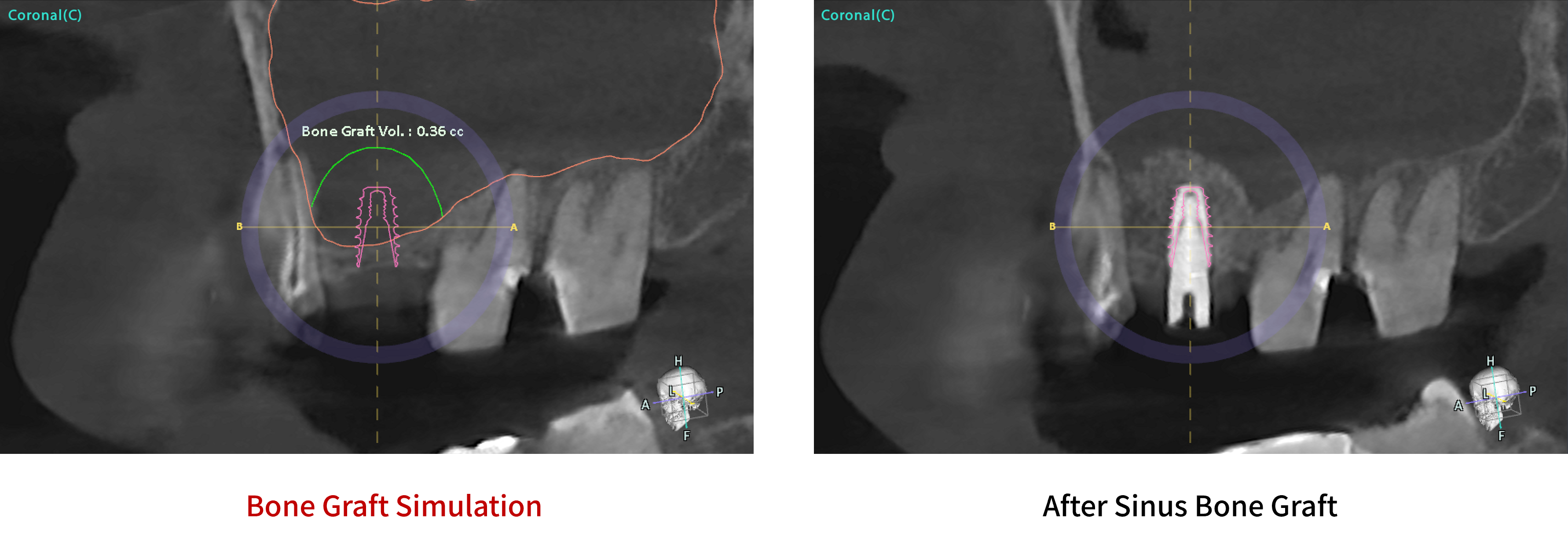 Based on segmented maxillary sinus data, the AI feature provides a visualization of the expected augmented volume in areas requiring sinus grafting.